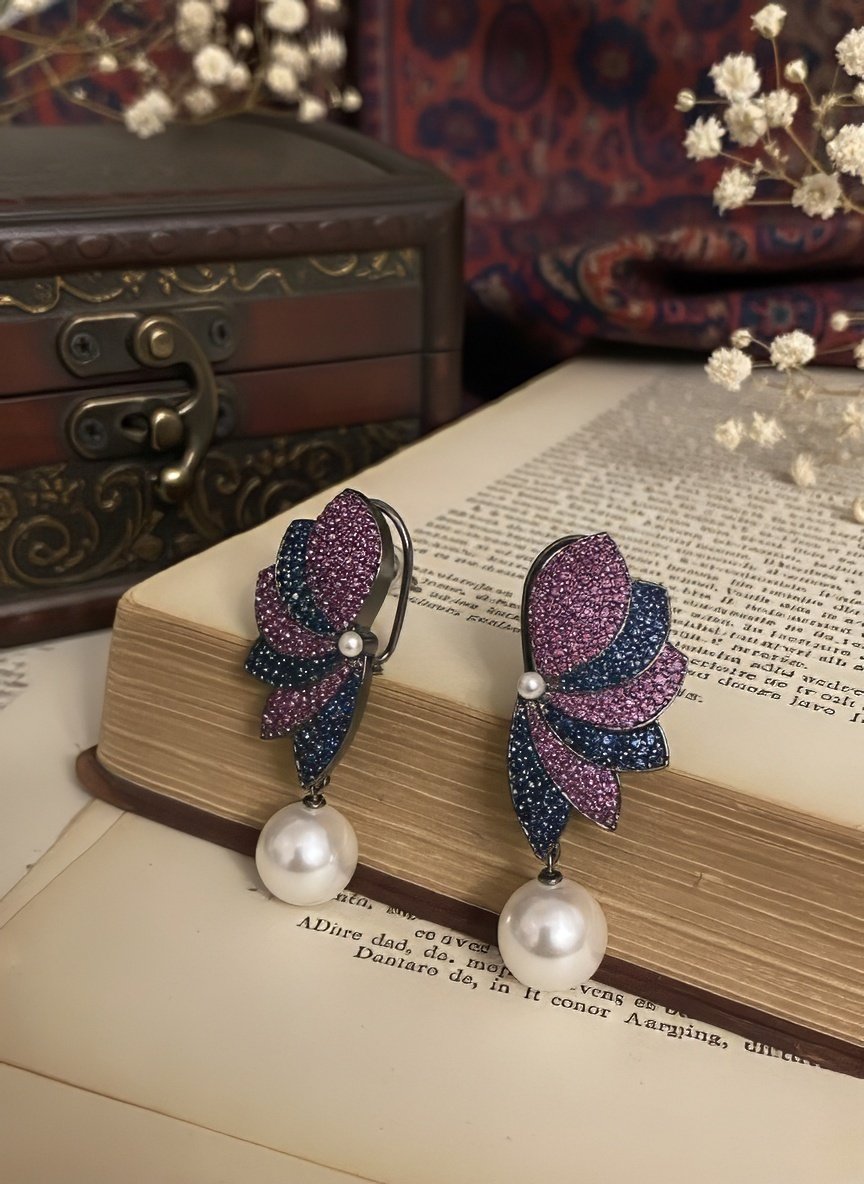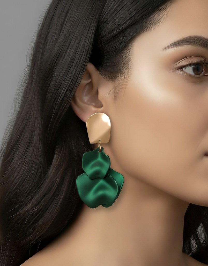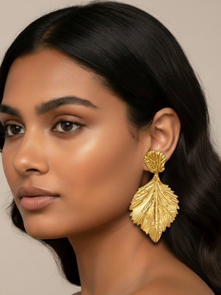 These exquisite earrings are a celebration of traditional artistry and expressive design. Crafted in a gold-toned metal with a vintage finish, each earring features a layered floral or feather-inspired ...