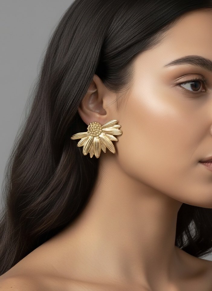 Make a bold yet graceful statement with these sculptural floral earrings, designed to capture the essence of sunlit blooms. Each piece features a large, gold-toned flower with intricately layered ...