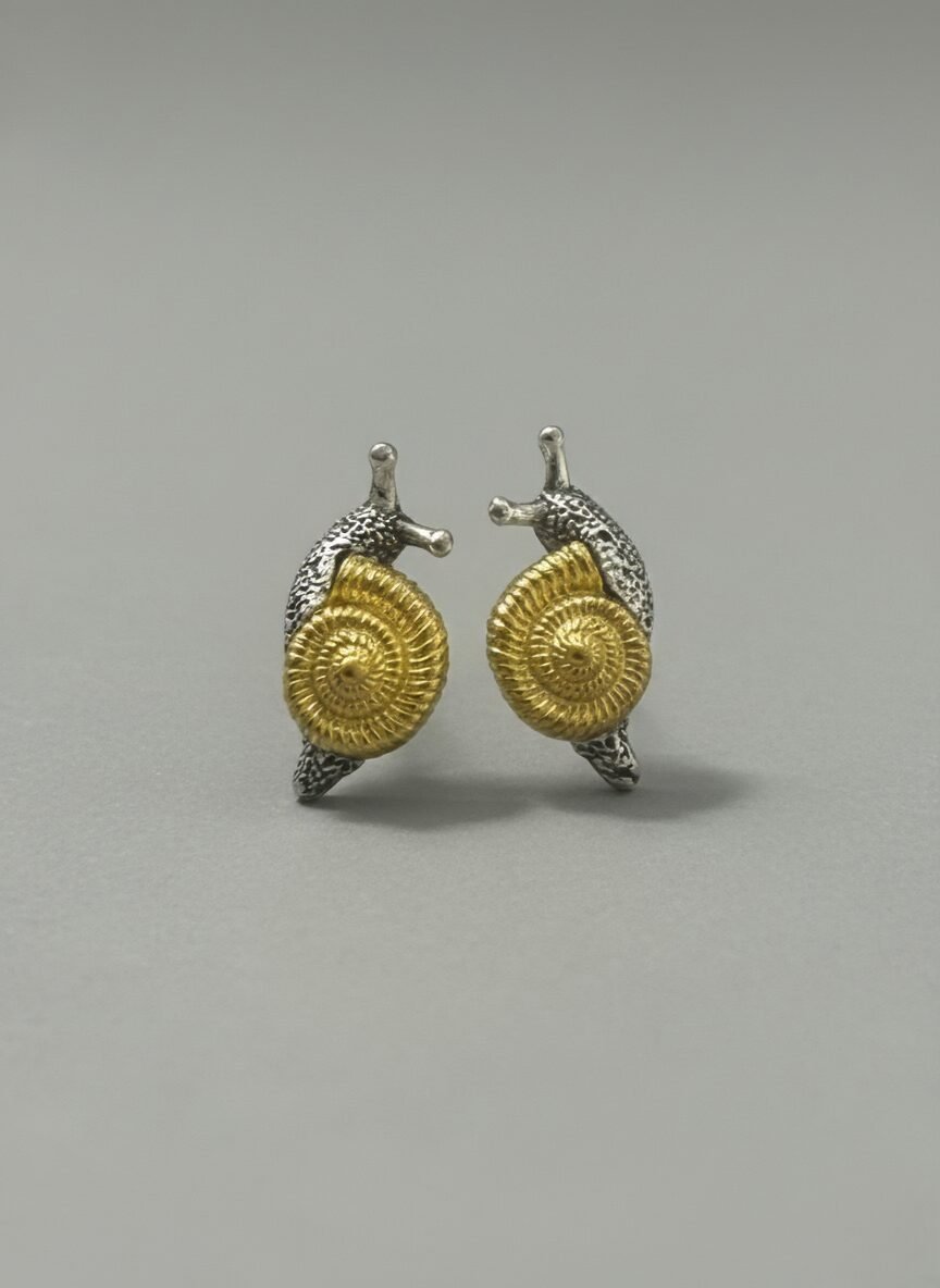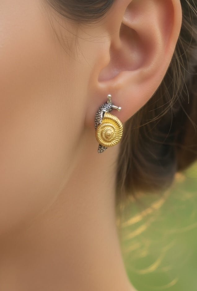 A striking close-up showcases a uniquely designed earring shaped like a snail, worn on a person’s ear. The earring features a golden spiral shell paired with a silver-toned body ...