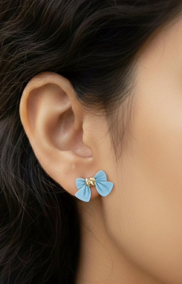 Delicate yet expressive, this pastel blue bow-shaped stud earring captures the essence of playful elegance. Crafted in a soft matte finish, the bow curves gently around a polished gold-tone ...