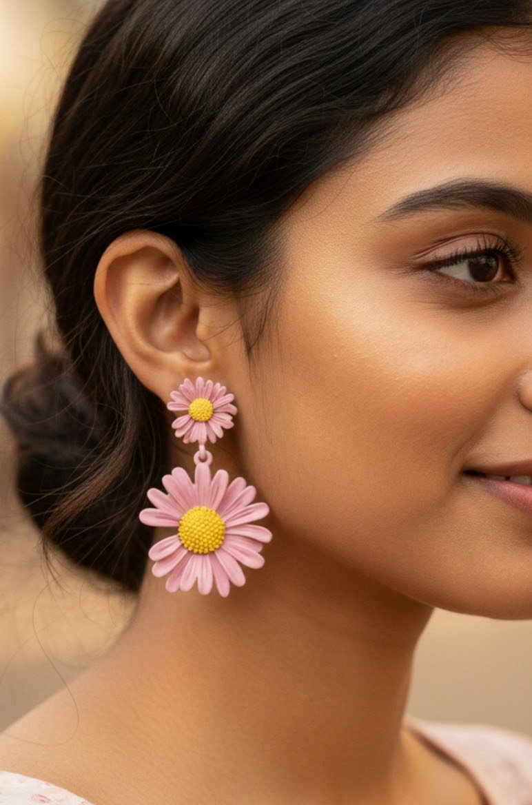 A close-up image captures the left side of a person’s face, focusing on the ear adorned with a vibrant floral earring. The design features two daisy-like flowers in soft ...