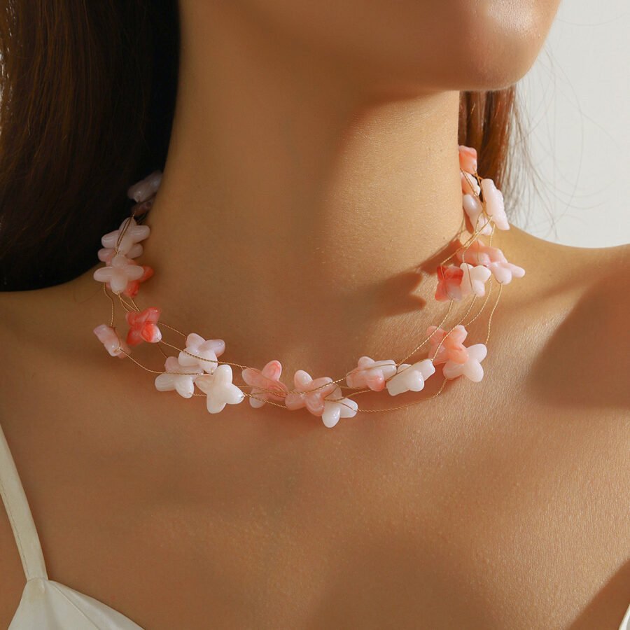 Delicate, dreamy, and full of whimsy—this multi-strand necklace features soft pastel butterfly beads in shades of blush pink, peach, and ivory. Strung on transparent threads, the layered design creates ...