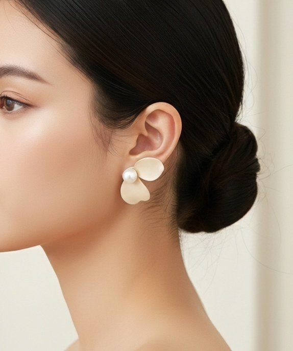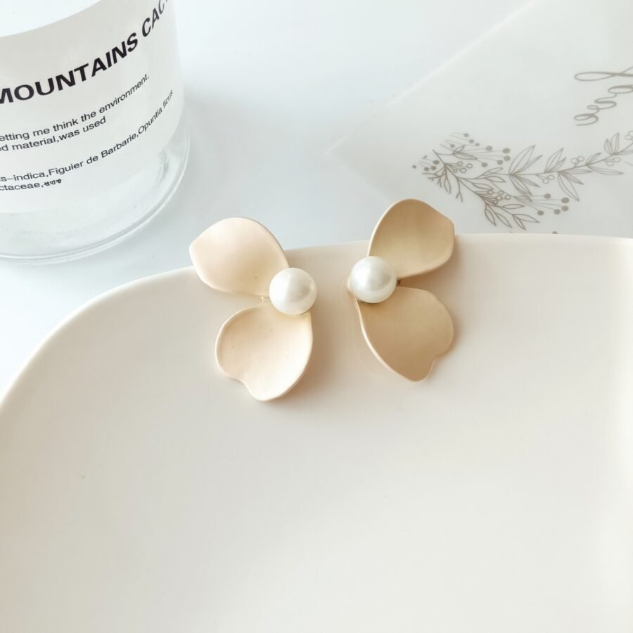 Gracefully sculpted to evoke the charm of a blooming flower, these earrings feature three soft beige petals encircling a luminous white pearl-like bead at the center. The delicate matte ...