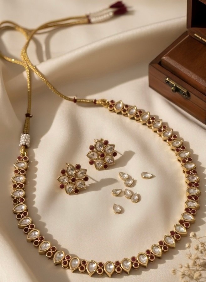This traditional Kundan jewelry set showcases timeless elegance through its intricate craftsmanship and rich design elements. The set includes a necklace and matching earrings, each meticulously arranged with alternating ...
