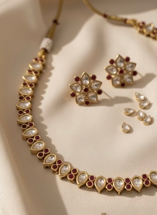 The Pearl Set includes earrings and a choker, intricately detailed and studded with Kundan in rose gold plating. These lightweight earrings and choker can be effortlessly carried through your ...