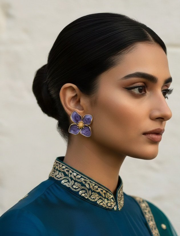 Celebrate artistry and elegance with these handcrafted floral earrings, designed to evoke the charm of a blooming garden. Each earring features a four-petal flower in rich marbled purple, accented ...