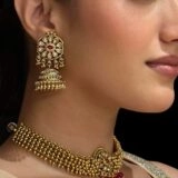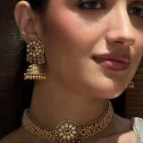 Earrings Design: The matching jhumka earrings perfectly complement the choker with their traditional bell shape and detailed carvings. They are embellished with red and white stones that match the choker’s centerpiece, and the dangling beads at the bottom add a hint of movement and sparkle. The earrings are lightweight and comfortable, making them ideal for long wear during special occasions.
