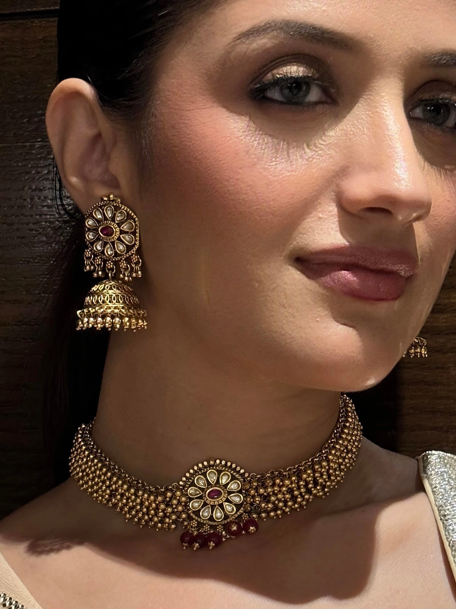 Choker Design: The choker features a beautifully intricate pattern with an antique gold finish that exudes a vintage appeal. It is adorned with delicate beads and a floral motif at the center, set with red and white stones that give it a regal touch. The surrounding beads add depth and texture to the choker, making it a statement piece that sits gracefully around the neck.