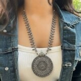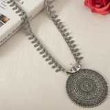 The pendant showcases concentric motifs and floral engravings, symbolizing harmony and timeless beauty. The decorative oxidized silver chain is uniquely designed with small dangling accents, adding depth and movement to the piece. This handcrafted beauty is a must-have for jewelry enthusiasts who appreciate vintage and tribal aesthetics.