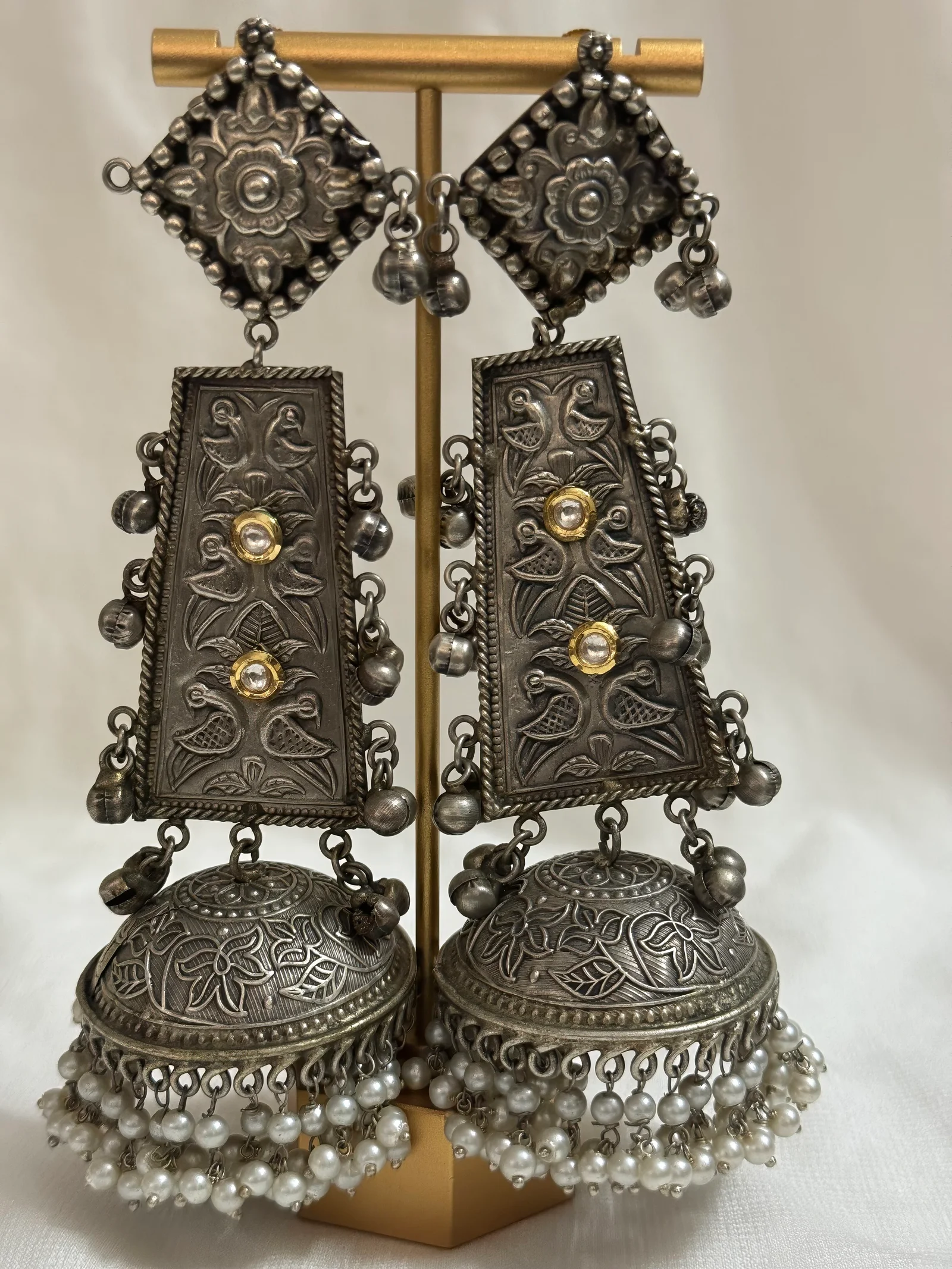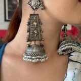 🔸 Grand oxidized silver dome-shaped jhumka, intricately carved with traditional floral designs and finished with multiple layers of dangling pearls, adding a touch of ethereal grace and movement.