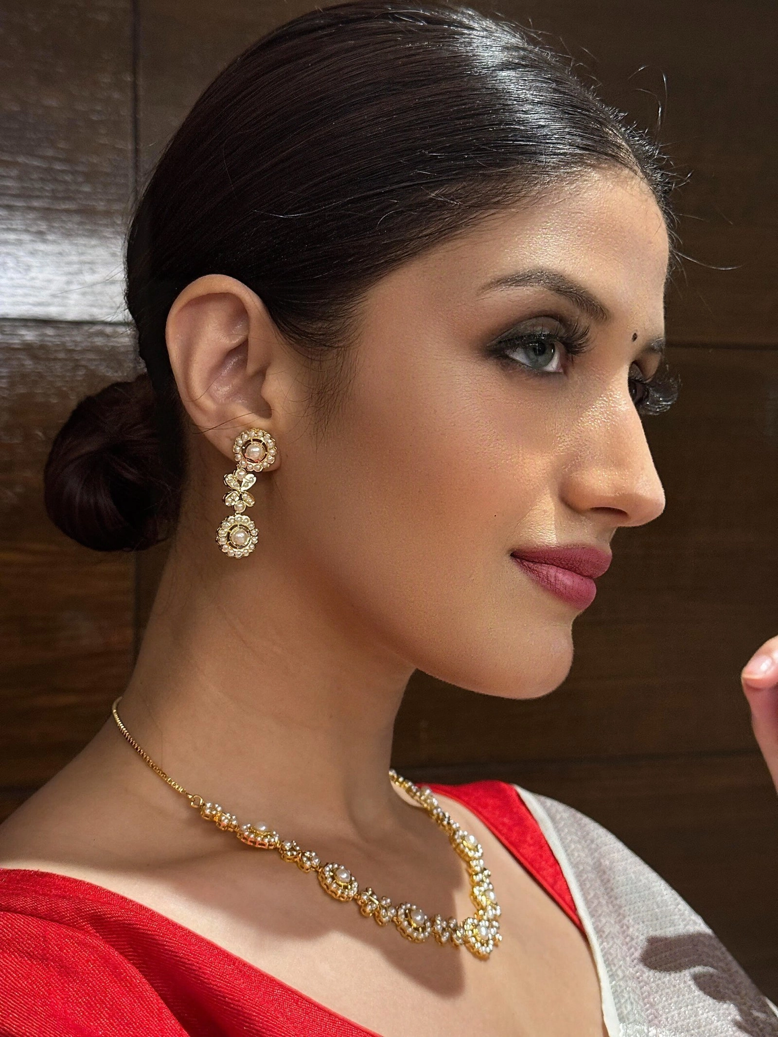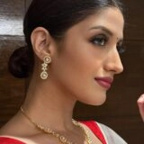 – Traditional Grace: Pair this necklace with a richly woven silk saree or a traditional lehenga for an authentic and elegant look. The combination of gold and pearls complements vibrant and deep colors, making it ideal for weddings, festivals, or religious ceremonies.