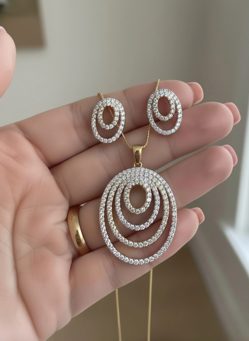 This stylish jewelry set features a contemporary design crafted in a radiant gold-tone metal. The pendant showcases three concentric oval loops, each encrusted with shimmering stones that add texture and brilliance to the overall silhouette. Suspended from a delicate chain, the pendant offers a bold yet elegant focal point suitable for festive wear or statement styling.