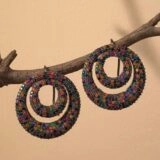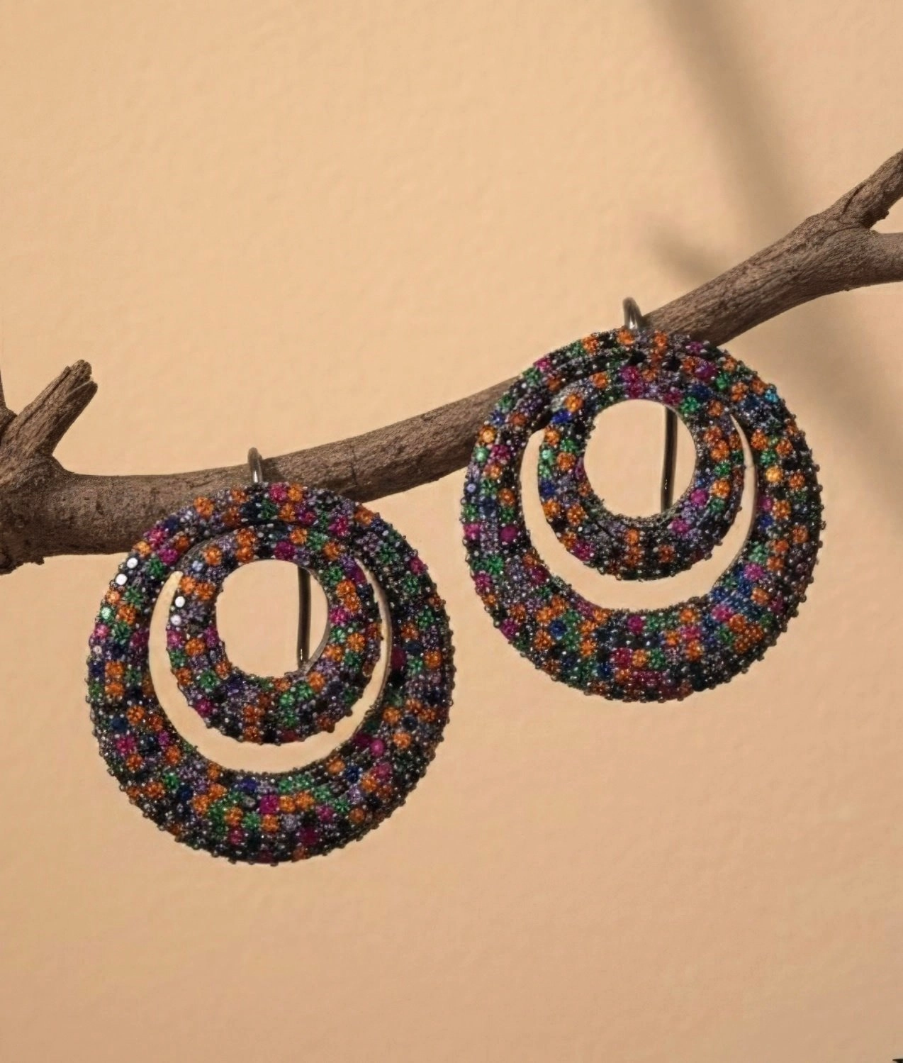 The intricate pavé setting ensures a dazzling sparkle from every angle, making these earrings a bold statement piece. The black rhodium finish adds a contemporary edge, enhancing the brilliance of the multicolored stones. Whether paired with a chic evening dress or a stylish ethnic ensemble, these earrings are sure to steal the spotlight.