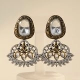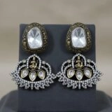 The earrings command attention with their large and ornate design, intricately detailed to captivate the eye. Crafted with meticulous artistry, they exude an air of opulence and luxury, adorned with sparkling CZ stones and featuring a divine Laxmi image at the center, adding a touch of divine elegance to the ensemble.