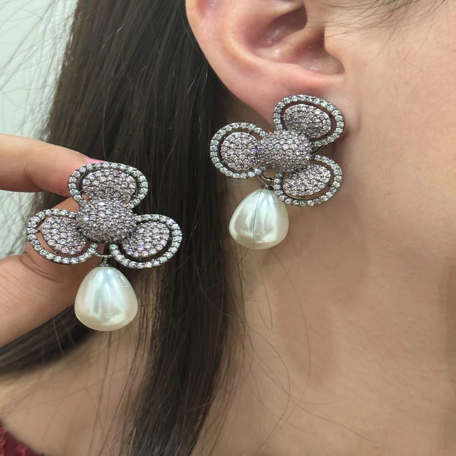 Pair these earrings with a pastel saree, an embroidered gown, or a sleek cocktail dress for a chic and polished look. Opt for a low bun or side-swept hair to highlight their stunning design. Complete your ensemble with dewy makeup, soft pink lips, and a touch of highlighter for an ethereal glow.