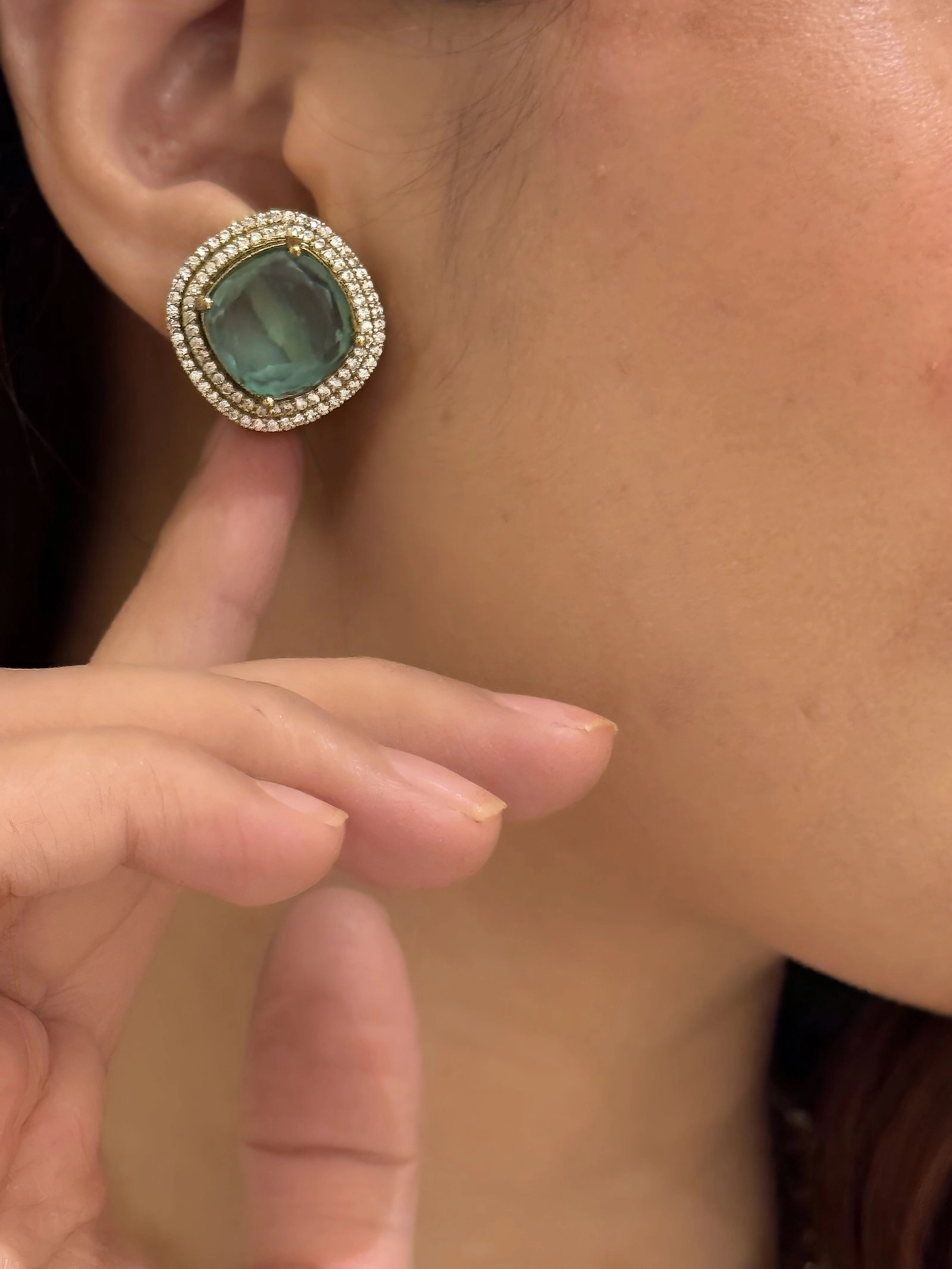 The matching earrings feature a unique half-moon design, highlighting the same green stone with delicate detailing, perfectly complementing the necklace. This set is perfect for formal events, cocktail parties, or intimate gatherings where elegance is paramount.