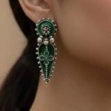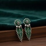 Silver 925 earrings with a green enamel design. The earrings with intricate and eye-catching design that make it stand out. It is a beautiful piece of jewelry that can be worn for any occasion. While not petite, their detailed craftsmanship adds a touch of elegance suitable for everyday wear.