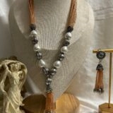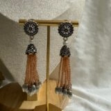 Paired with matching long tassel earrings, adorned with silver dome caps, peach beads, and oxidized silver embellishments, this set is a perfect blend of traditional charm and contemporary sophistication.