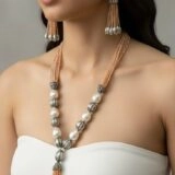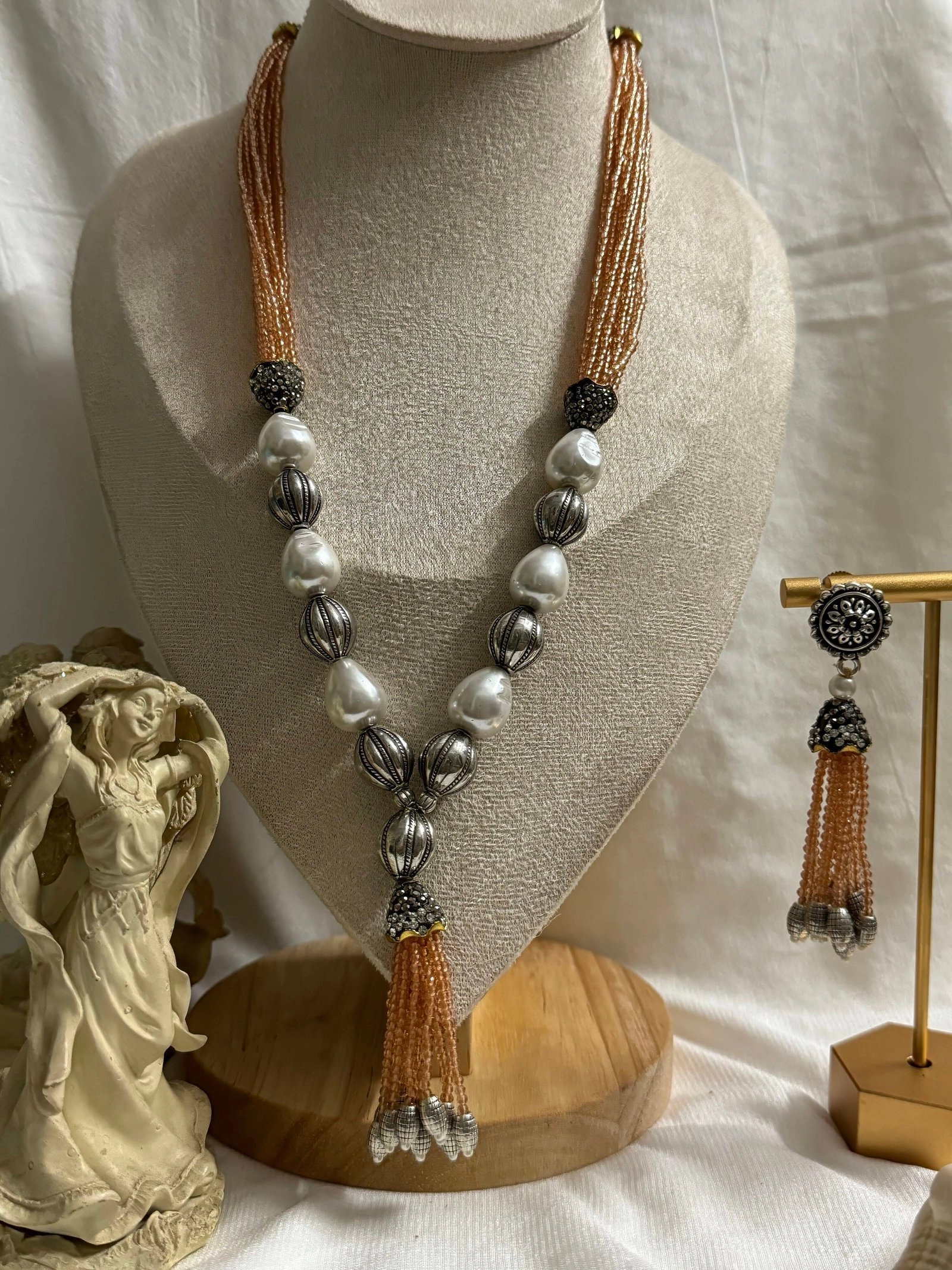 Elevate your elegance with our Ethereal Grace jewelry set, a breathtaking fusion of delicate peach beads, lustrous pearls, and antique silver elements. This handcrafted necklace features multi-strand peach beaded strings, beautifully complemented by baroque pearls and oxidized silver beads, adding a touch of vintage charm. The intricate pave-set metallic accents enhance the luxurious appeal of this piece.
