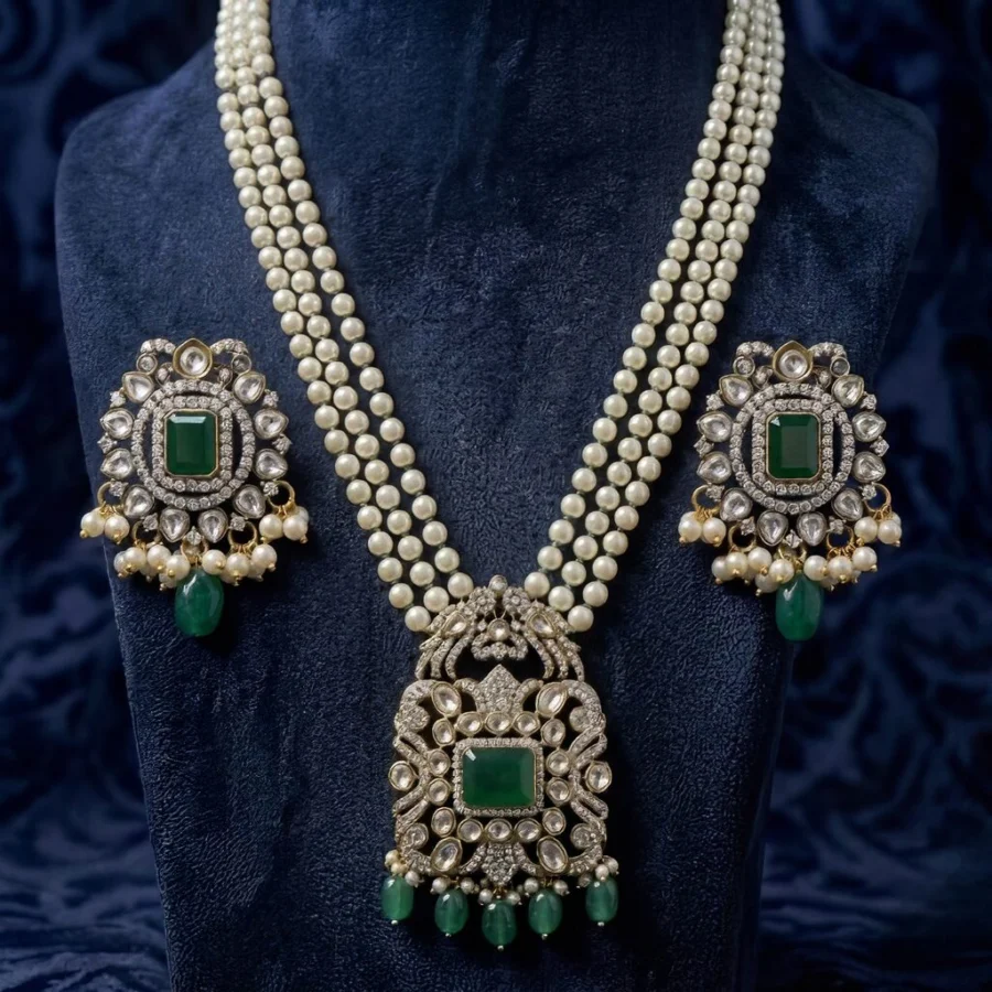 - Necklace: Multi-strand beaded design with pearl and silver bead accents