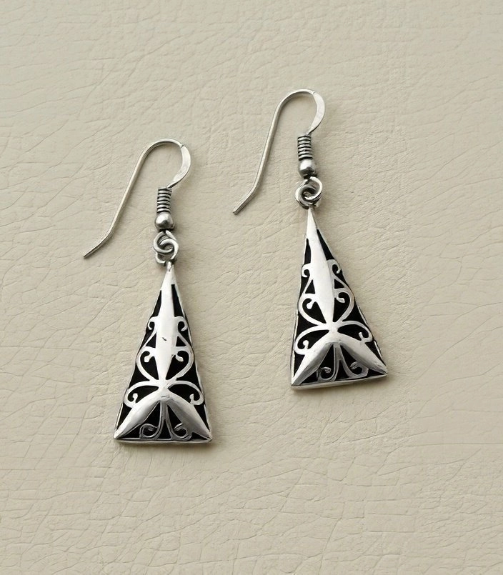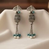 These earrings, crafted from sterling silver (925) and adorned with teal color beads, boast an elegant dangling design featuring intricate detailing. Secured with hooks, the beads inject a vibrant splash of color, elevating the earrings’ visual appeal.