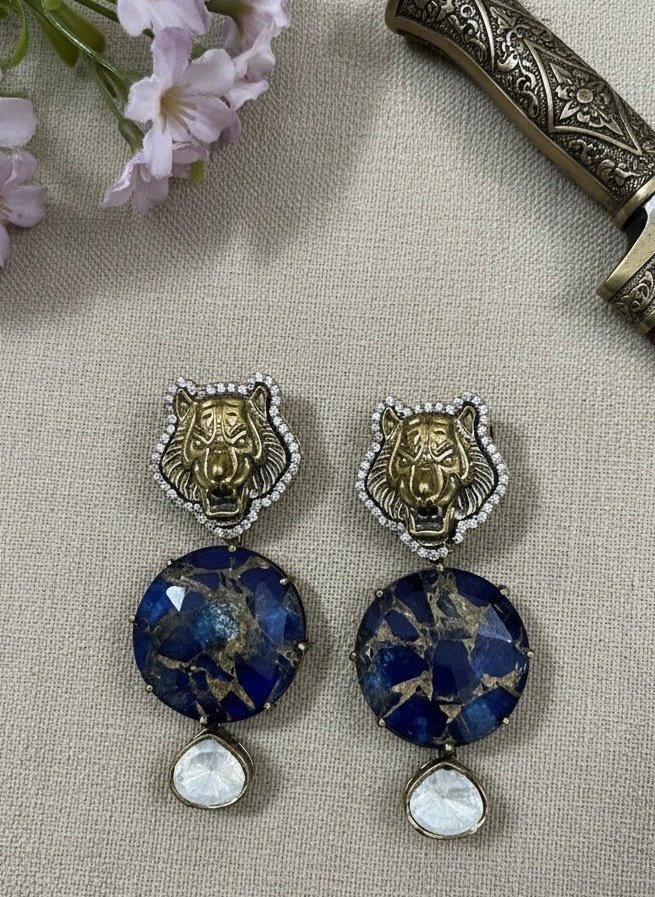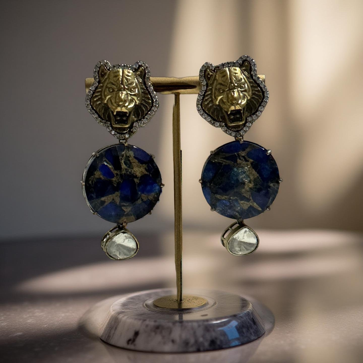 Suspended below is a deep blue marbled stone, adding an aura of mystique and royalty. The raw, artistic finish enhances the natural beauty of the stone, making each piece unique. A clear faceted gemstone dangle completes the look, adding a touch of elegance and movement to this powerful statement accessory.