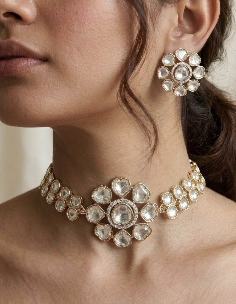 This luxurious choker set is a masterpiece of symmetry and sparkle. The necklace features two elegant rows of round, faceted gemstones set in radiant gold, culminating in a breathtaking central motif. At its heart lies a brilliant round gemstone, encircled by eight delicately shaped stones arranged in a floral pattern—an emblem of grace and timeless beauty.