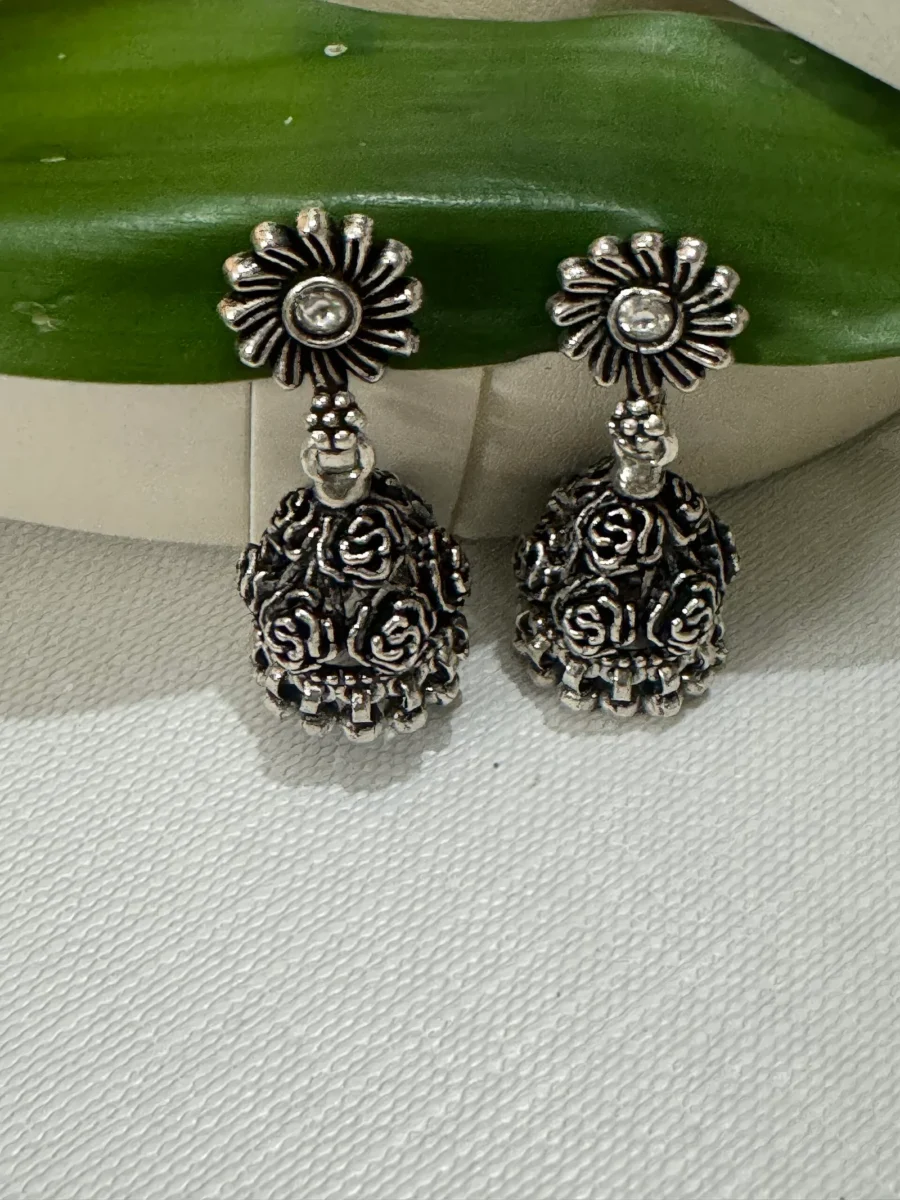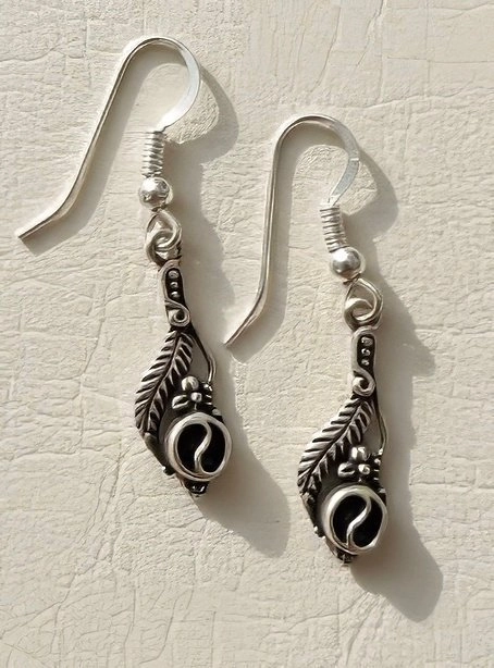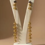 These ornate earrings are a striking example of traditional craftsmanship, blending bold design with intricate detailing. Each earring begins with a decorative black-and-gold stud, followed by a textured gold element resembling a leaf or petal. Beneath this, a cluster of small gold beads adds richness and dimension.
