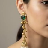 These ornate jhumka earrings are a stunning showcase of traditional craftsmanship, blending vibrant gemstones with intricate gold detailing. Each earring begins with a large green gemstone at the top, flanked by two delicate white stones that add brilliance and contrast.