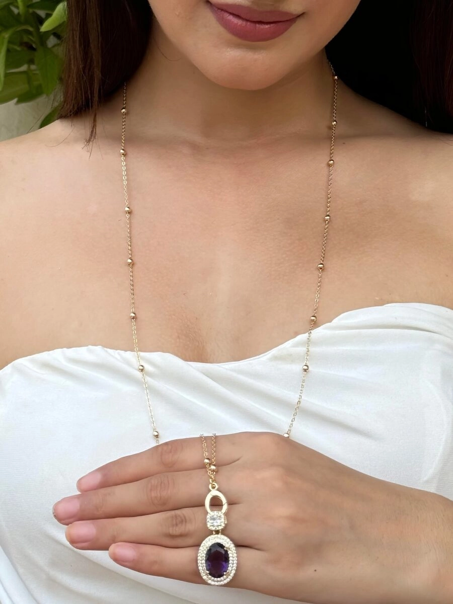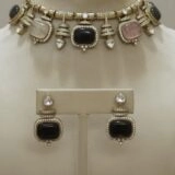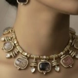 The matching earrings mirror the necklace’s artistry, with a rectangular black stone bordered in gold and diamond-like detailing, topped by a teardrop-shaped clear stone. Together, the set creates a harmonious ensemble that balances elegance with opulence.