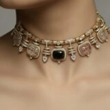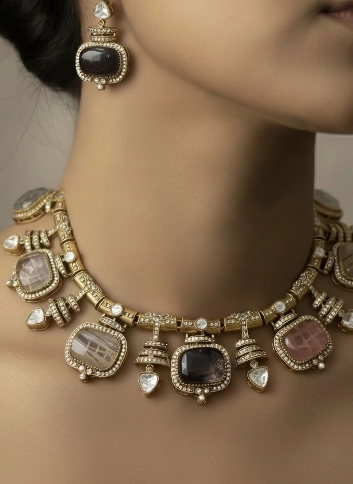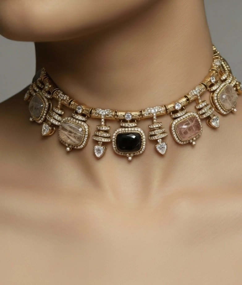 This ornate necklace set is a luxurious showcase of traditional craftsmanship, blending bold gemstones with intricate detailing. The choker-style necklace features a symmetrical arrangement of rectangular and teardrop-shaped stones in black, pink, and translucent hues, each bordered with delicate gold and diamond-like accents. At the center lies a striking rectangular black stone, framed by smaller stones and decorative motifs that enhance the grandeur of the design.