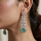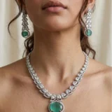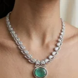 Elevate your elegance with this exquisite jewelry set, featuring a necklace and matching earrings crafted to perfection. The necklace showcases two rows of brilliant, hand-cut clear gemstones arranged in flawless symmetry, leading to a captivating round emerald centerpiece. This vibrant green stone is encircled by a halo of sparkling diamonds, enhancing its brilliance and depth. The earrings mirror the necklace’s artistry, with cascading diamonds that culminate in emerald drops framed by halos of shimmering stones.