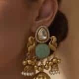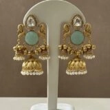 Perfect for weddings, festive occasions, and ceremonial gatherings, these earrings embody regal sophistication. The interplay of peacock motifs, mint-green floral accents, gold detailing, and pearl fringe ensures they stand out as a statement accessory—traditional, vibrant, and unforgettable.