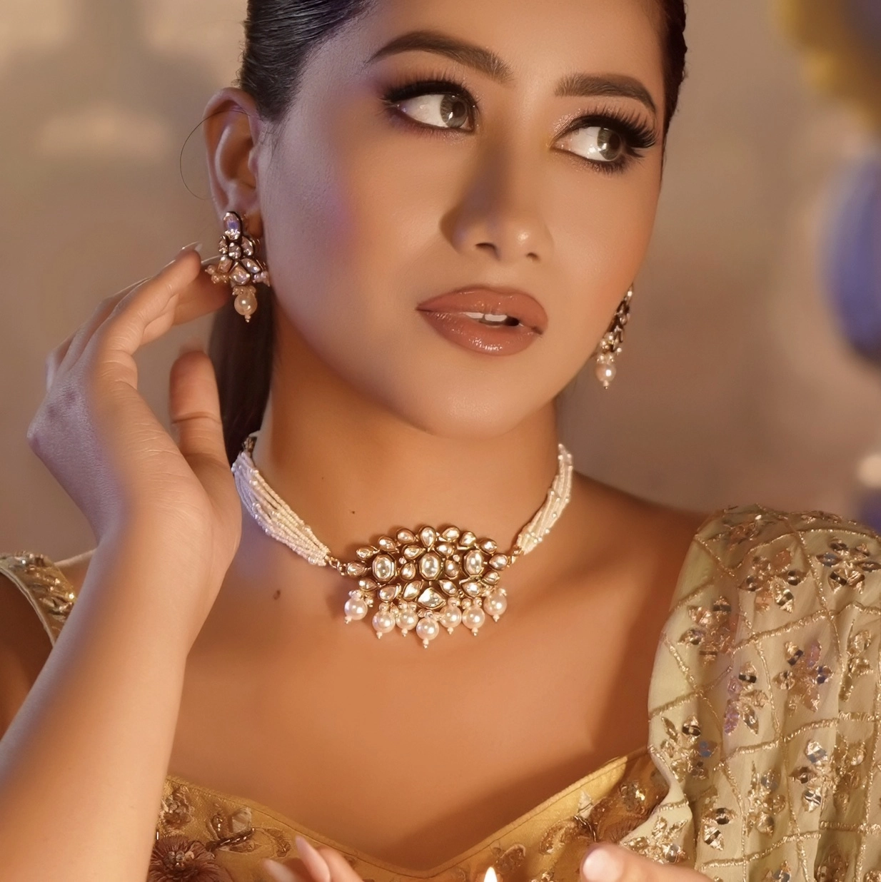 The Kundan Elegance choker set with pearls is versatile and can be worn on various occasions, including weddings, festivals, formal events, or even to add a touch of elegance to everyday attire. Its timeless design makes it suitable for both traditional and contemporary outfits, allowing you to effortlessly elevate your look wherever you go.