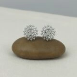 These exquisite earrings are a celebration of timeless elegance and precision craftsmanship. Designed in a floral sunburst silhouette, each earring features a central oval-shaped cluster of brilliant-cut diamonds, radiating outward in symmetrical layers of smaller round stones. The intricate arrangement creates a dazzling burst of light, capturing brilliance from every angle.