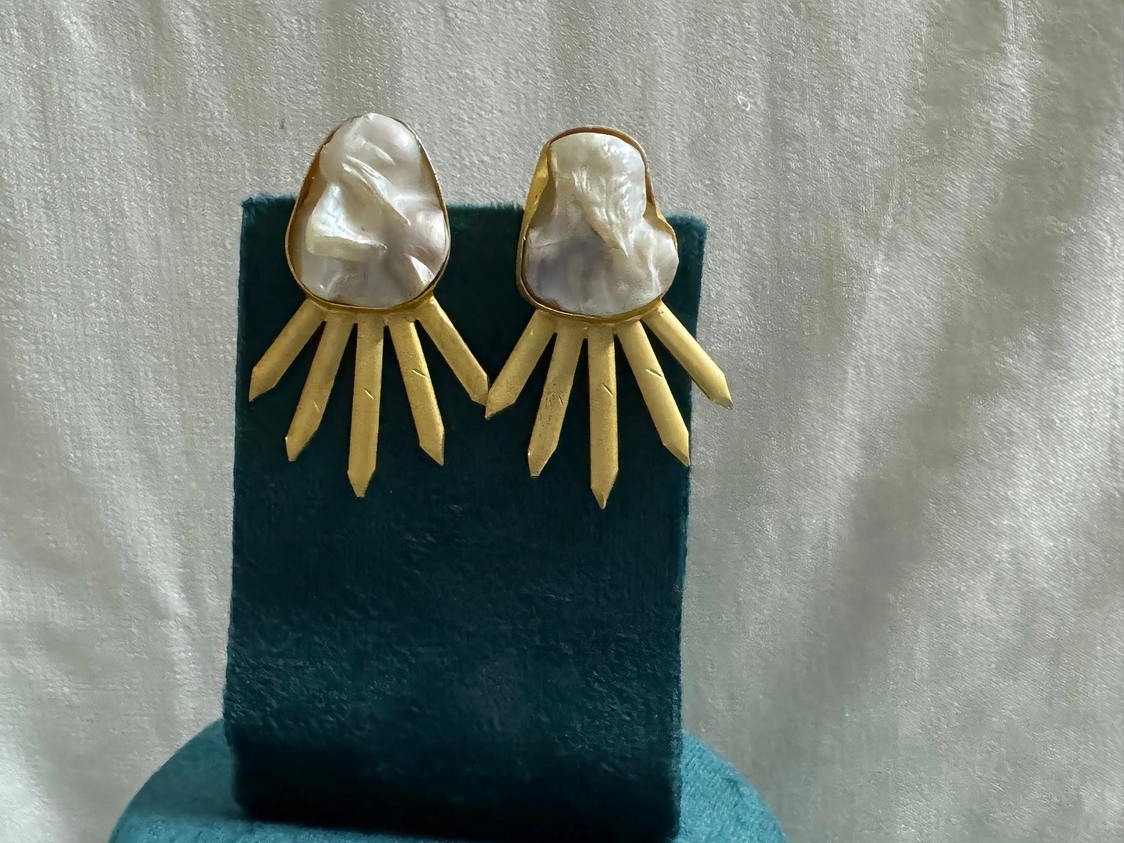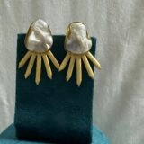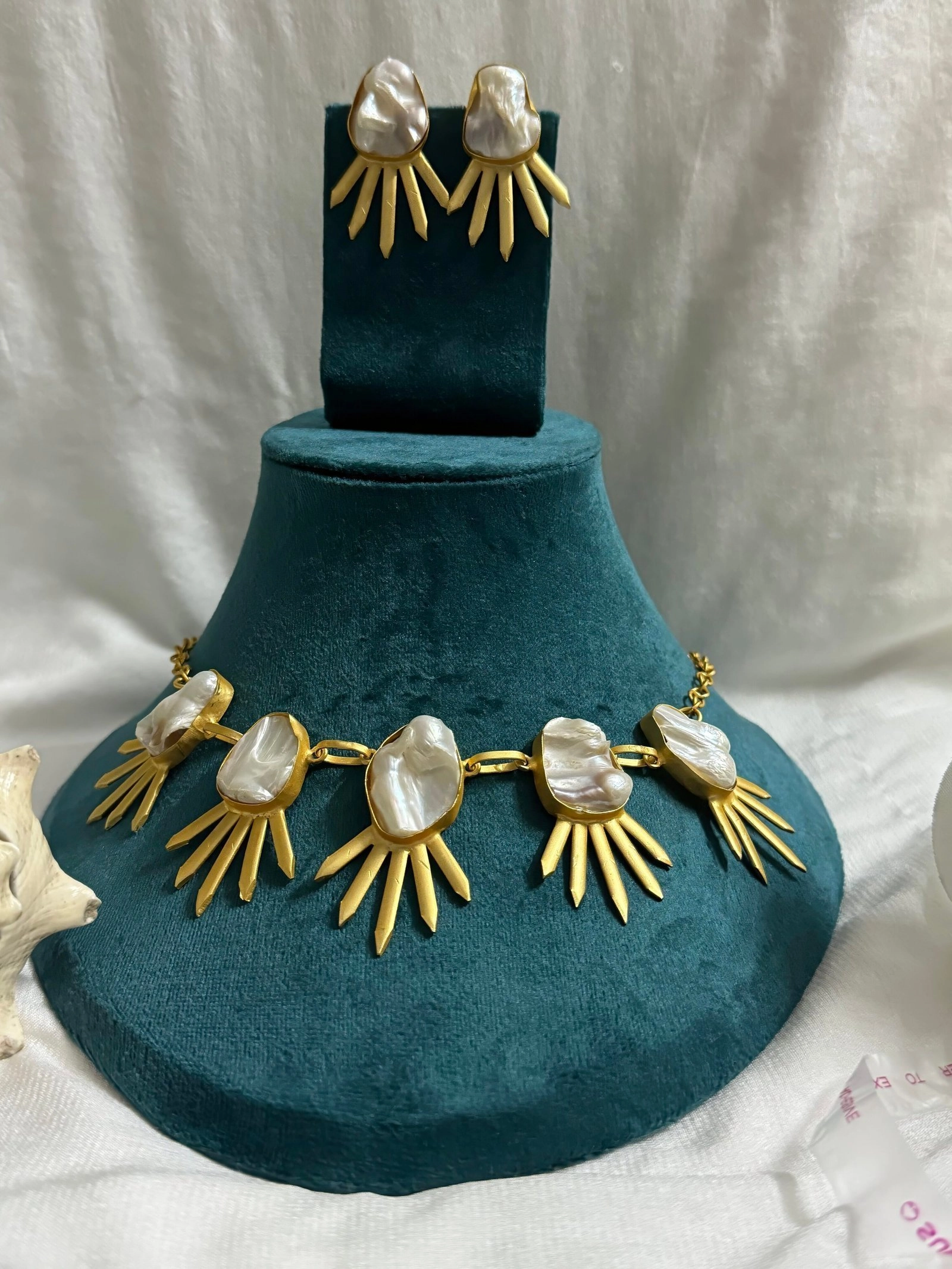 A striking necklace with unique baroque pearls, each surrounded by golden sunburst-inspired designs, making every piece one of a kind. - Matching Earrings: