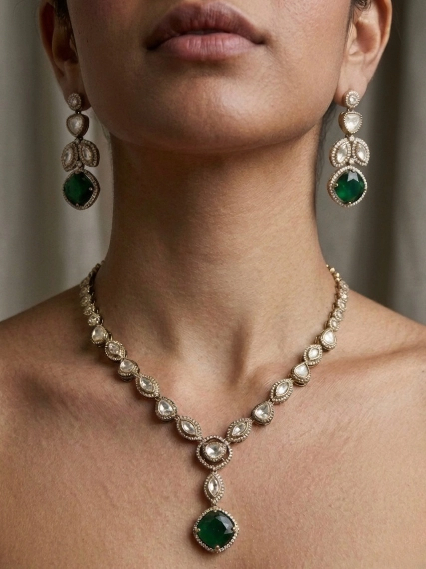 Elevate your personal style with this exquisite set. The combination of sparkling moissanite stones and classic Polki design creates a piece that is both elegant and enduring. Make a statement with jewelry that reflects your refined taste.