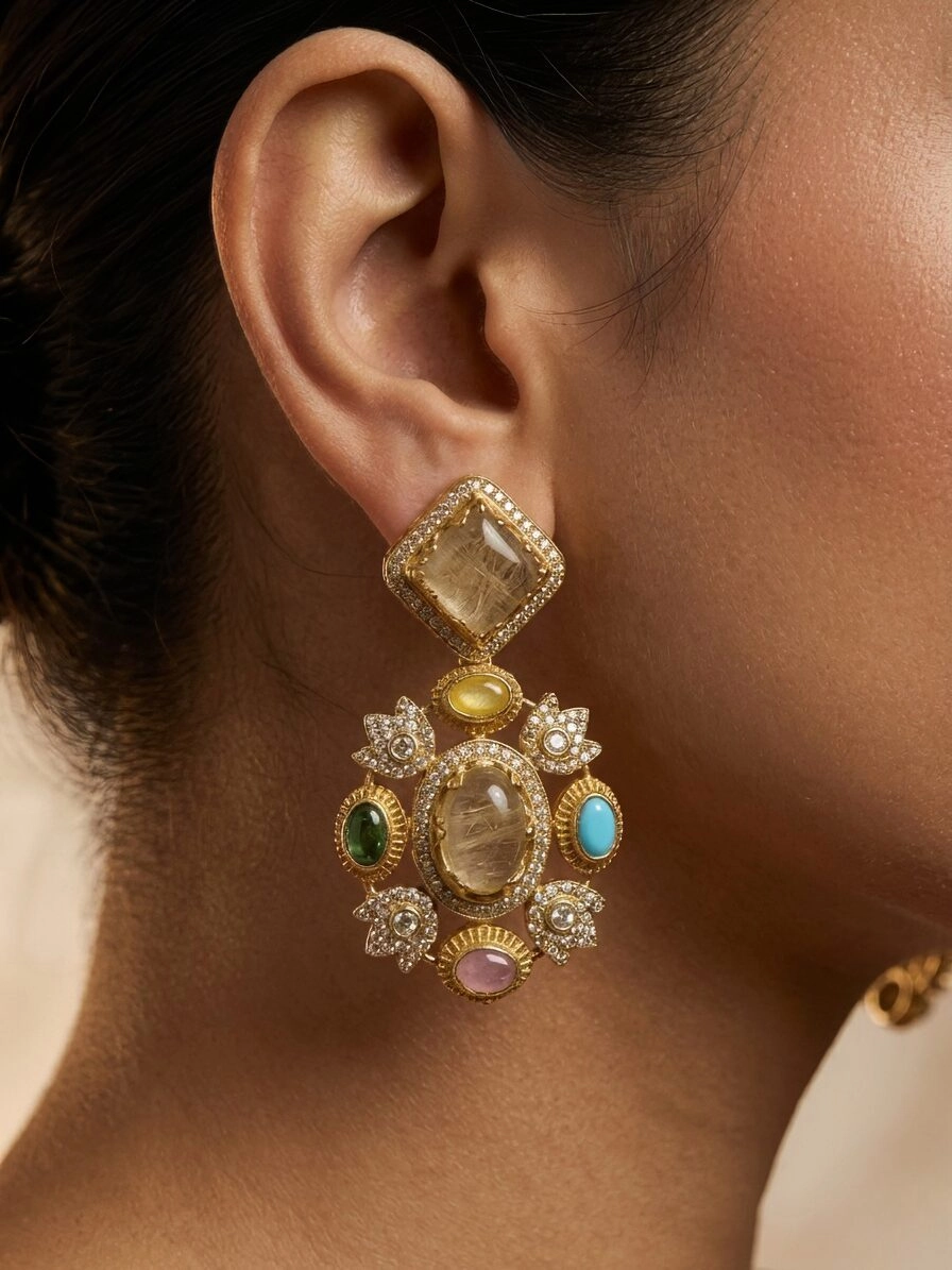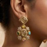 The matching earrings mirror the choker’s elegance, showcasing the same multicolor gemstone arrangement framed in gold and diamond accents. Together, the set creates a harmonious balance of bold color and refined craftsmanship, making it ideal for weddings, festive occasions, and ceremonial gatherings.