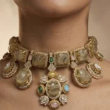 The interplay of vivid gemstones, shimmering diamonds, and intricate Kundan artistry ensures this set stands out as a centerpiece accessory—luxurious, regal, and unforgettable.