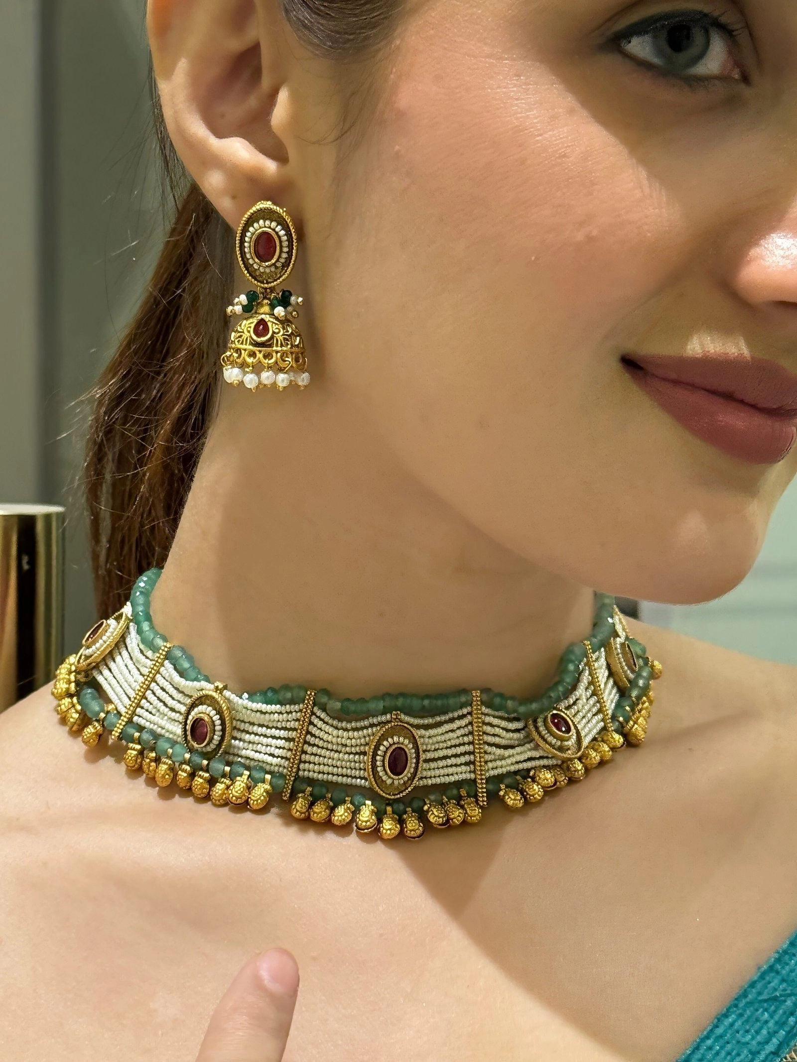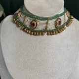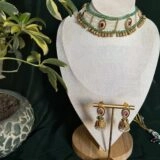 - For Traditional Wear: Pair this choker set with a classic silk saree, preferably in hues like emerald green, maroon, or beige, to match the jewelry’s tones. Add bangles, a sleek bun, and a small bindi for a complete traditional look.