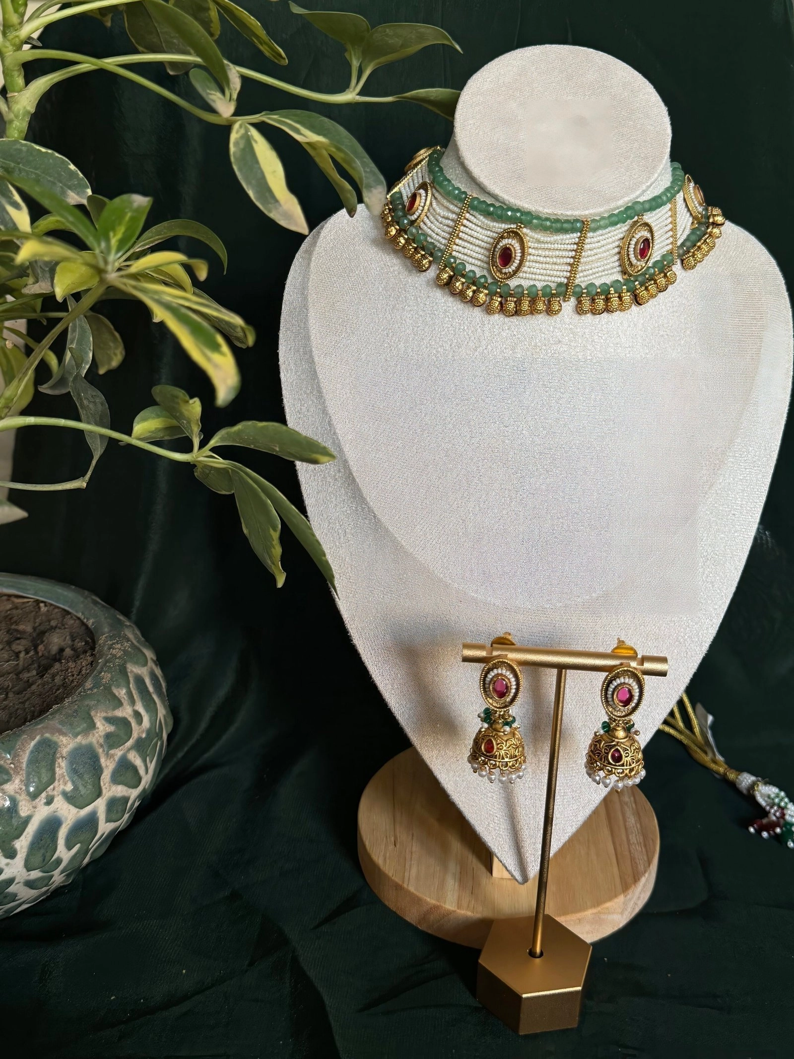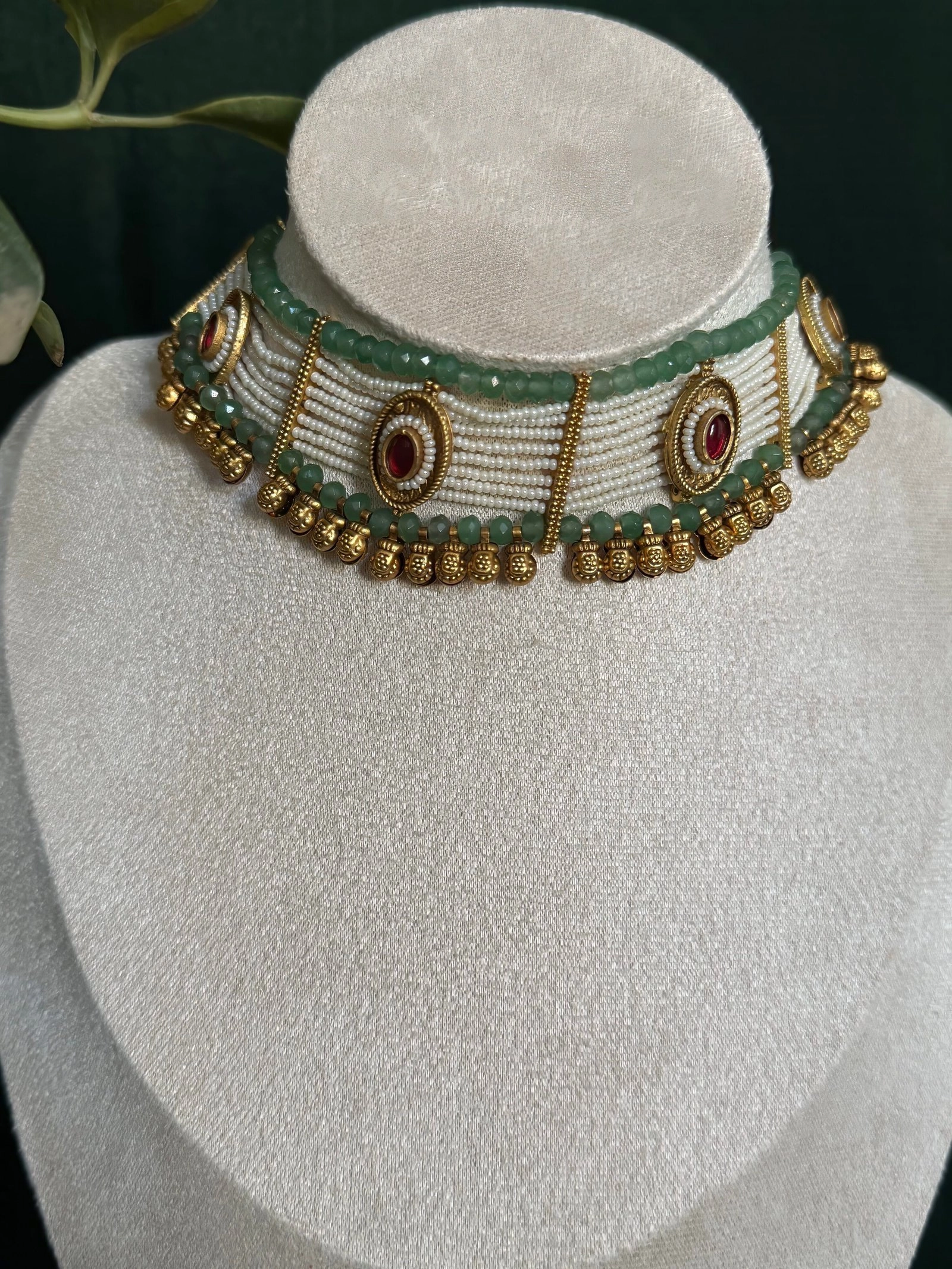 Immerse yourself in the elegance of traditional craftsmanship with this mesmerizing jewelry set. The choker is meticulously designed with multiple rows of lustrous pearls interwoven with vibrant green beads, symbolizing grace and prosperity. Gold-plated accents and intricate motifs highlight the opulence of the piece, while the striking red oval stones add a pop of vibrant color, making this set a true masterpiece.