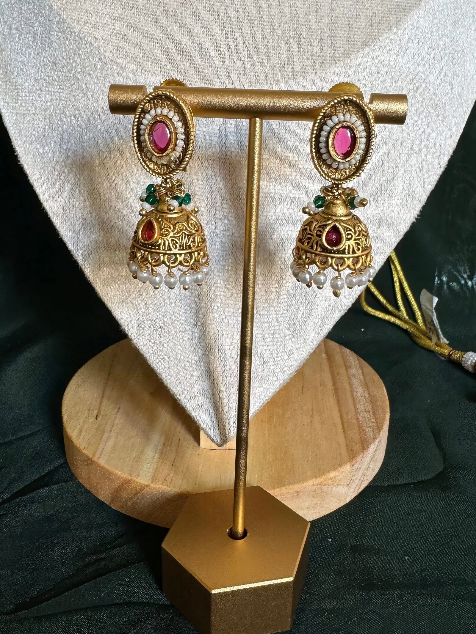Each detail of the choker reflects artistry, from the delicate gold bead drops along the border to the perfect symmetry of its design. The matching earrings feature intricately crafted gold jhumkas adorned with pearls and a touch of green and red stones, exuding timeless charm.