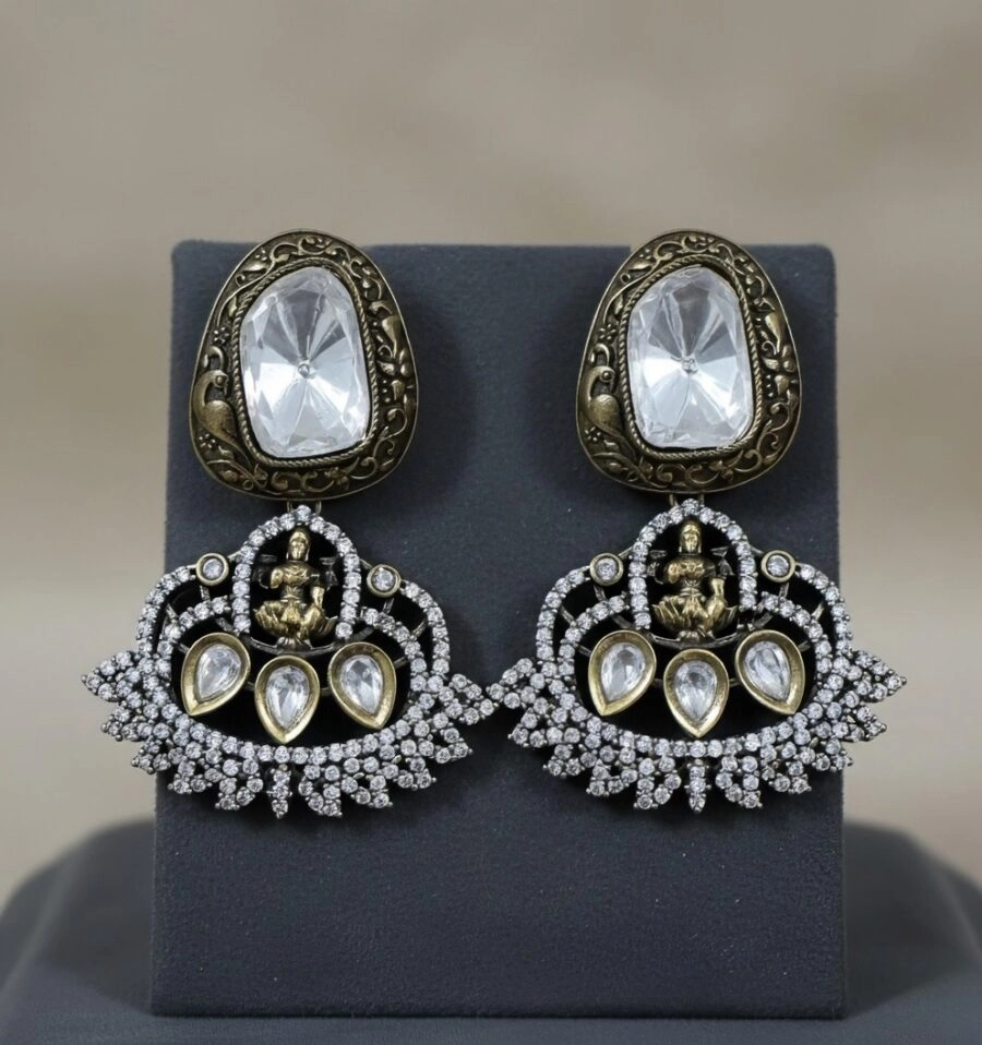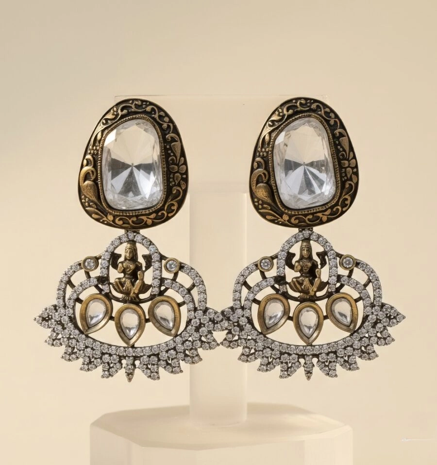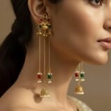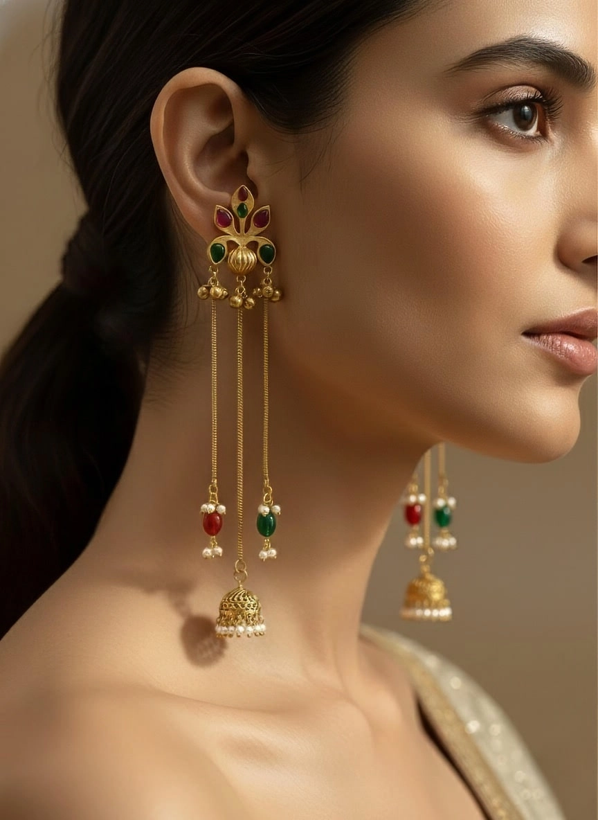 Symmetrical and meticulously detailed, these earrings embody the grandeur of Indian craftsmanship. Perfect for weddings, festive celebrations, or cultural gatherings, they bring together the richness of gold, the vibrancy of gemstones, and the purity of pearls in a harmonious composition.
