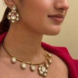 A sleek gold-tone necklace adorned with teardrop-shaped polki stones, creating a balance of subtlety and sophistication. - Statement Earrings: