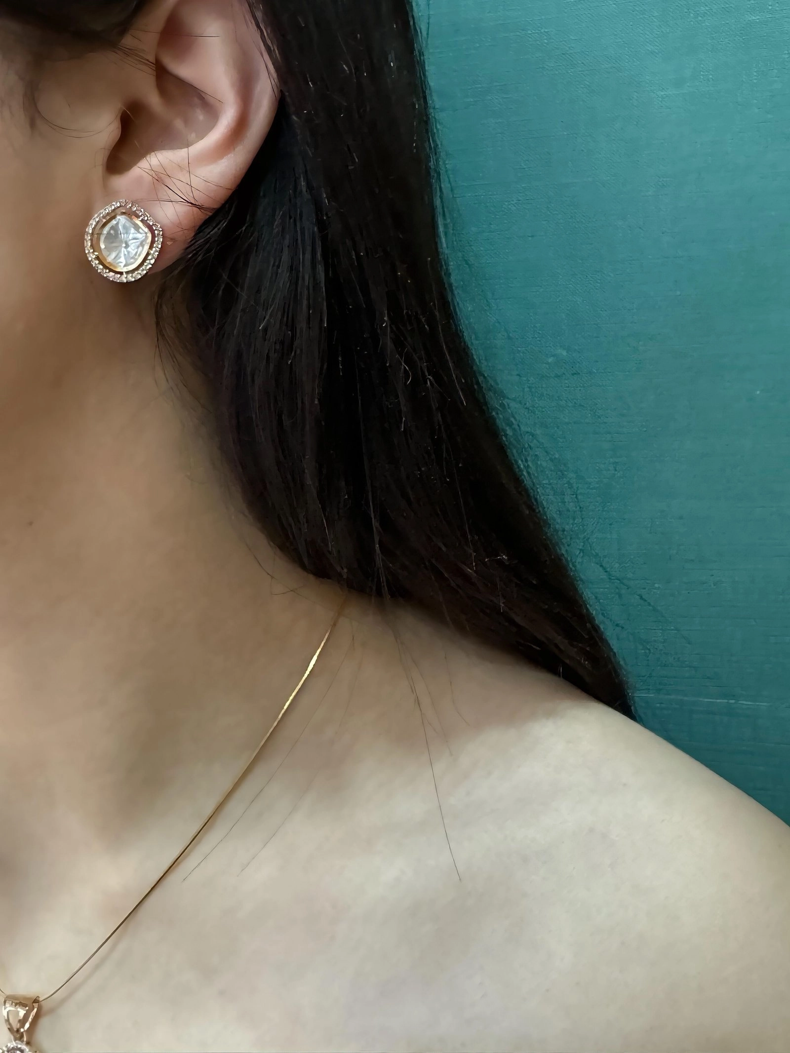 ✨ Earrings: Matching crystal-accented studs to complete the look with understated elegance.