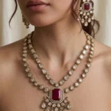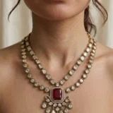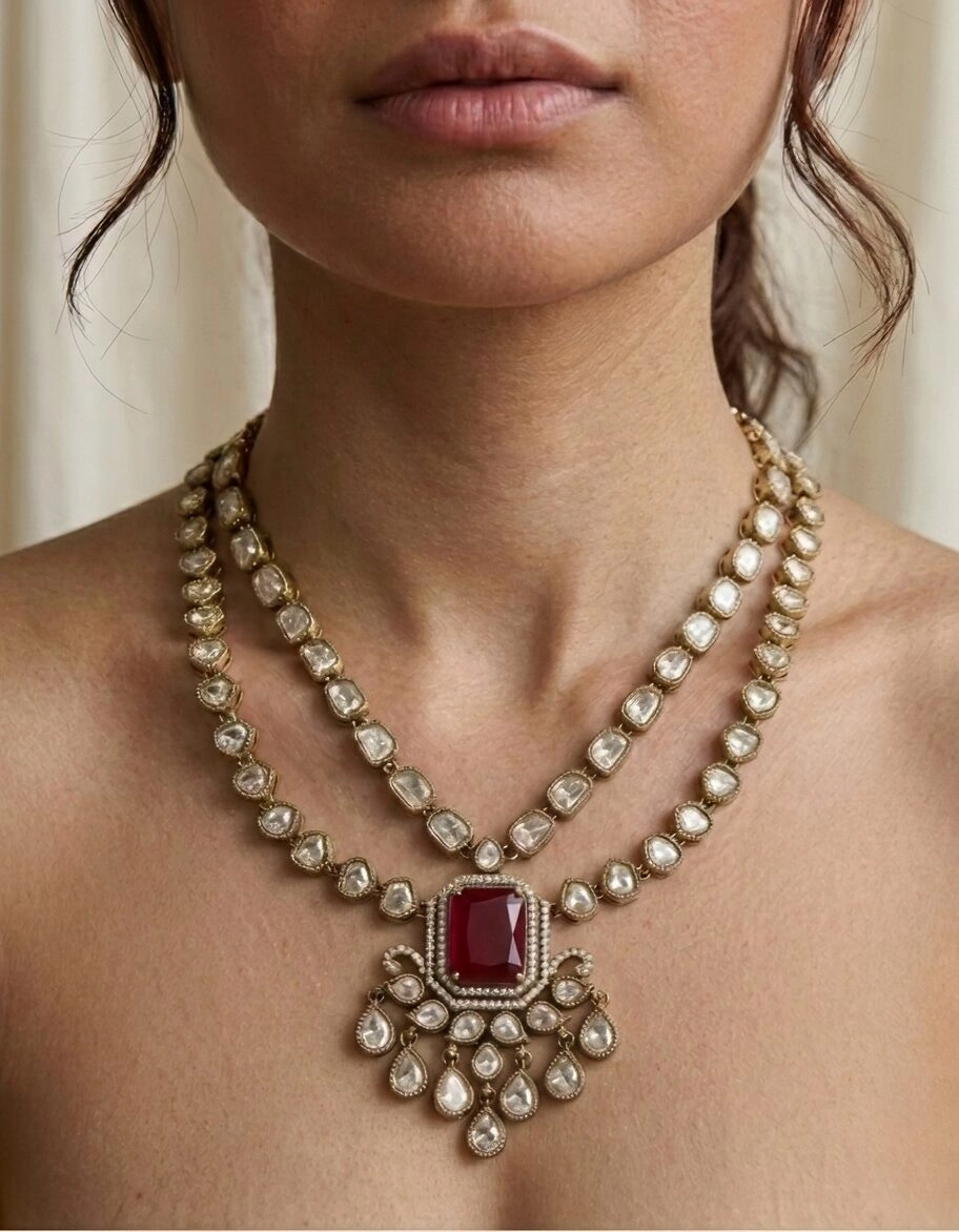 Introducing our exquisite double layer necklace set featuring semi-precious rubies and moissanite Polki stones. This exquisite set features a captivating double-layered necklace adorned with vibrant rubies and moissanite polkis. Embrace luxury and style with this stunning jewelry ensemble.