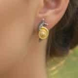 A striking close-up showcases a uniquely designed earring shaped like a snail, worn on a person’s ear. The earring features a golden spiral shell paired with a silver-toned body that elegantly curves outward, mimicking the natural form of a snail. The soft blur of the background enhances the visual focus on the earring’s intricate craftsmanship and organic silhouette. This imaginative piece blends artistic flair with wearable fashion, making it a standout accessory for those who appreciate nature-inspired jewelry with a touch of whimsy.