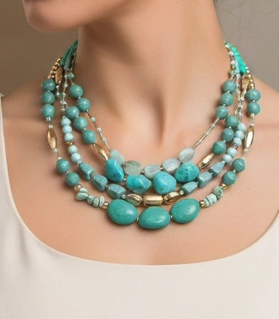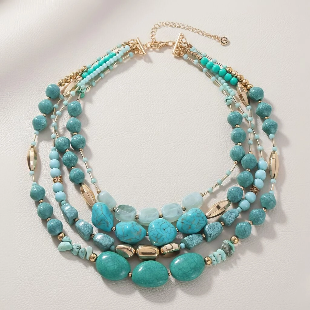 A symphony of color and texture, this multi-strand necklace is crafted from an exquisite mix of turquoise beads in varying shapes, sizes, and shades—from serene seafoam to bold cerulean. Each strand is thoughtfully arranged to create a cascading effect across the collarbone, offering depth and movement with every turn.