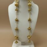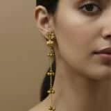 From this decorative centerpiece, a series of fine gold chains descend gracefully, each adorned with evenly spaced clusters of polished gold beads. The symmetrical arrangement creates a rhythmic flow, highlighting the earrings’ refined balance and timeless appeal.