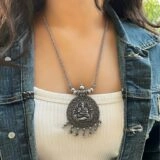 This bold, circular pendant is adorned with detailed filigree patterns, enhancing its antique appeal. The dangling ghungroo charms add an elegant rhythmic touch, making it a perfect blend of tradition and sophistication. The sturdy oxidized silver chain complements the grandeur of the pendant, ensuring durability and a regal look.